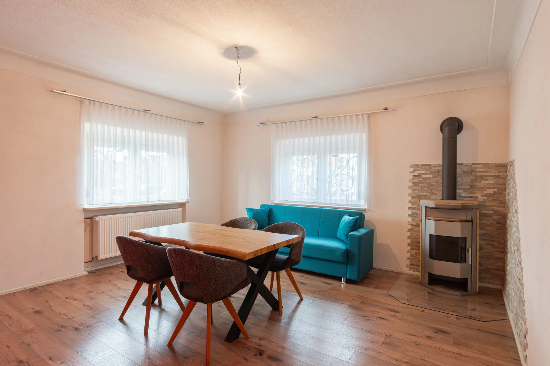 Diese gepflegte Doppelhaushälfte aus dem Jahr 1938 bietet auf ca. 113 m² Wohnfläche ausreichend Platz für junge Familien. Das Haus wurde im Innenbereich bereits umfassend modernisiert (Fenster, Elektrik, Sanitär, Böden, Kamin) und ist sofort bezugsbereit. Die Raumaufteilung umfasst ein Wohnzimmer mit Schwedenofen, eine Küche mit Zugang zur Terrasse, mehrere Schlafräume sowie ein Tageslichtbad und ein separates Gäste-WC.
