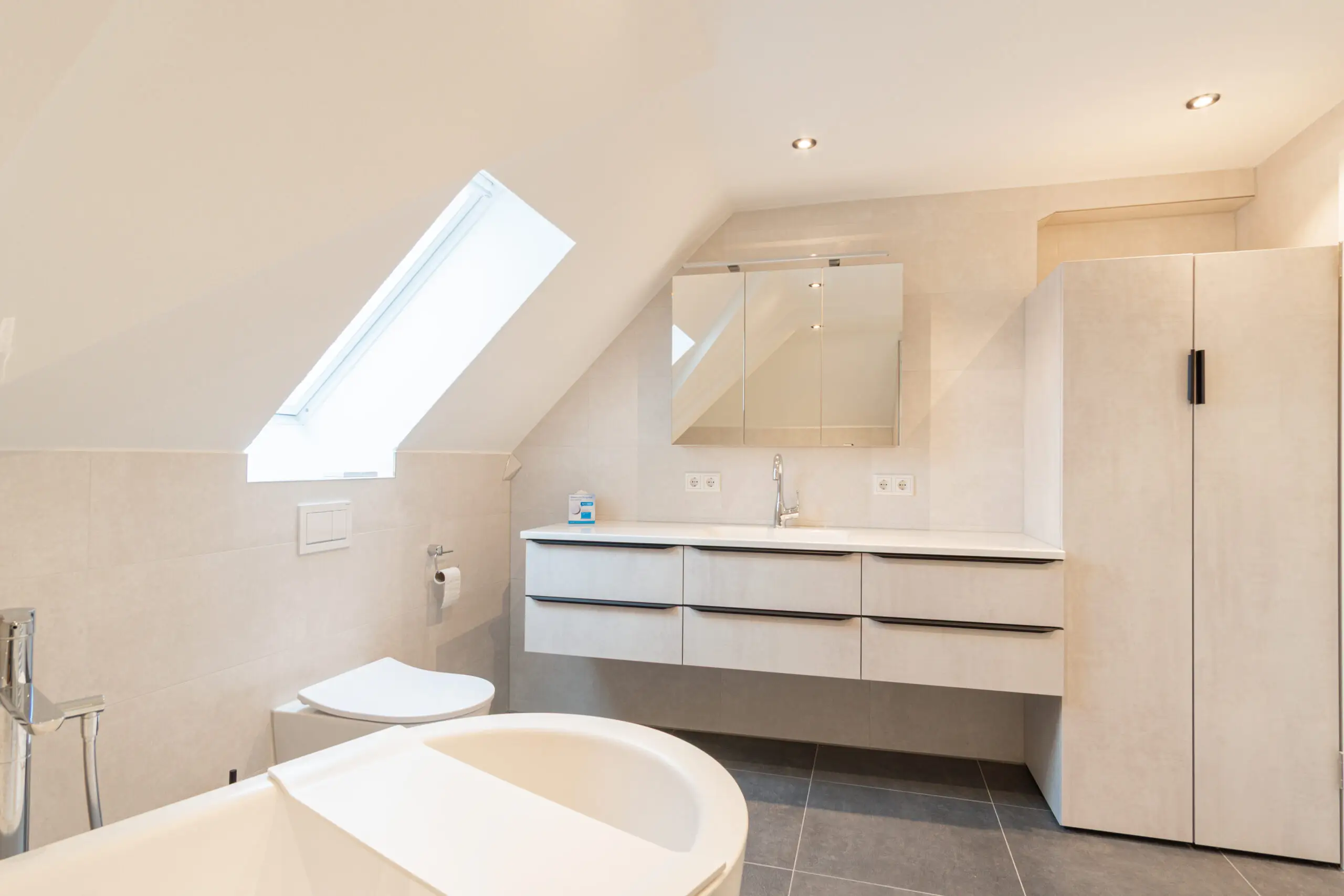 •Maßgefertigte Einbauküche & exklusives Bad mit Dusche, freistehender Wanne und Wasch-/Trockner-Kombination